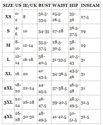 SIZE US IE/UK BUST WAIST HIP INSEAM